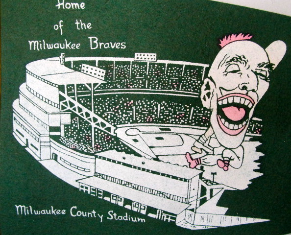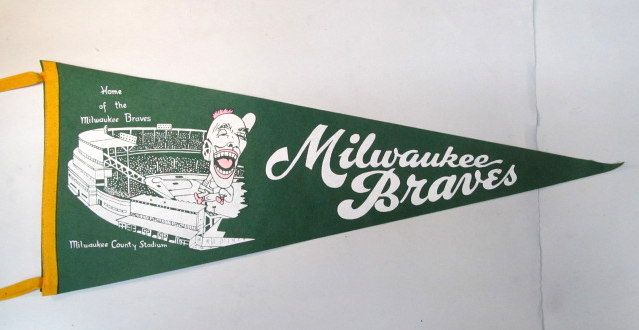 pennant. MILWAUKEE BRAVES. white lettering on green felt. golden yellow border with matching tassles. tip intact. early 1960s' vintage. MILWAUKEE COUNTY STADIUM HOME OF THE MILWAUKEE BRAVES. graphic of stadium with the Indian logo mascot at bat. approx. 29.5" long. near mint. 119.50