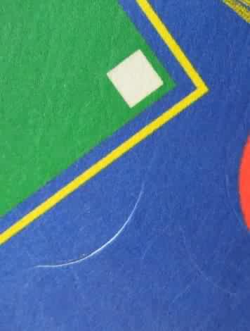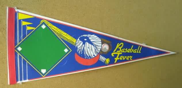 pennant. BASEBALL FEVER. multicolored on dark blue with yellow lettering. red border. has green baseball diamond with "half moon" slits designed to hold a photo or team photo of your choice. tip intact. approx. 30" long. near mint to mint. 15.00