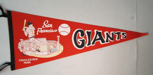 pennant. SAN FRANCISCO GIANTS. black and white lettering on orange felt. black border and tassels. the very tip of the point is squared. color illustration of batter and CANDLESTICK PARK. tiny pin holes in corners. early 1960's vintage. approx. 30.5" long. excellent to near mint. 50.00