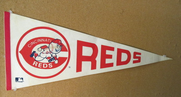 pennant. CINCINNATI REDS. red on white. has the MLB logo. point intact. stiffer felt material. 1970's vintage. smaller size approx. 12" long. tiny tack holes. colors bright and strong. excellent to near mint. 10.00