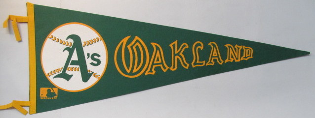 pennant. 1969 OAKLAND A'S. yellow and white on green. has the 1969 dated MLBPC logo. yellow border and tassels. very tip of point squared off. standard size approx. 29.5" long not counting tassels. pin holes in corners. near mint. 39.50