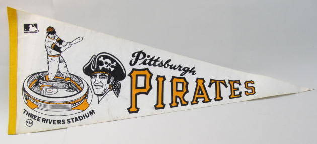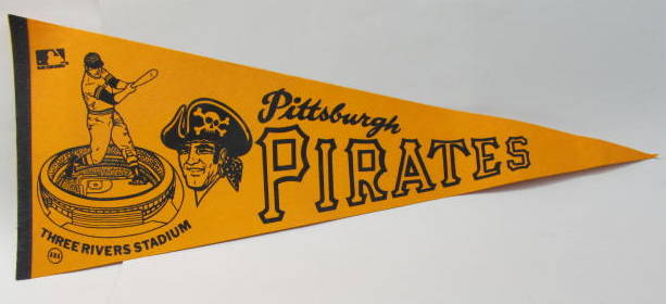 pennant. PITTSBURGH PIRATES Three River Stadium. yellow and black on white. yellow border. tip intact. has illus. of mascot and batter standing over the stadium. made by ARA. approx. 30". early 1970's vintage. light soiling and wear. very good to excellent. 22.50