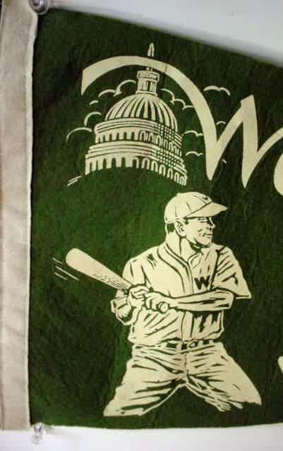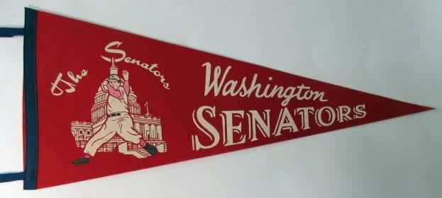pennant. WASHINGTON SENATORS. white on red. dark blue border strip & tassels. tip intact. illustration in white/pink/black of Pitcher standing in front of Capitol Building. please note that there is no MLPP logo - 1960's vintage. very minor darkness along 1/4" of top and bottom edge. pinholes in corners. excellent plus to near mint. 99.00