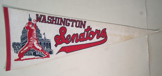 pennant. WASHINGTON SENATORS. red and blue on white. red border. tip intact. stiffer material. graphics of a baseball pitcher in front of the Capitol building. no MLPP logo. 1960's vintage. minor soiling otherwise excellent. 60.00