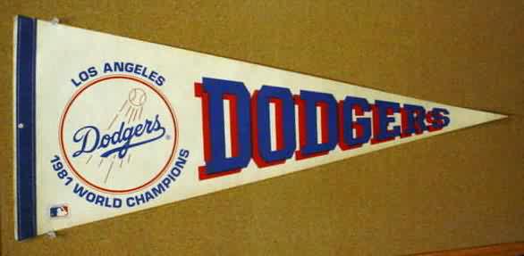 pennant. LOS ANGELES DODGERS 1981 WORLD CHAMPIONS. blue and red on white. dark blue border. tip intact. as made - no tassels and hole punch in border. approx. 30" long. pinholes in corners. excellent. 24.00