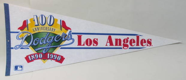 pennant. LOS ANGELES DODGERS 100 Anniversary 1890-1990. multicolored on white. blue border. tip intact. approx. 30" long. as made with hole in center of border. no flaws. near mint to mint. 25.00