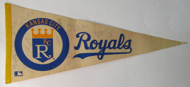 pennant. autographed 1978-80 KANSAS CITY ROYALS. blue and gold on white. yellow border. tip is intact. large team logo. autographed in blue ballpoint by 18 team players plus another one on reverse. includes: Onix Concepcion; Randy McGilberry; Rich Gale; Manny Castillo; Jim Gaudet; Dave Chalk; et al. many of the names I do not recognize - possibly from spring training. faint red color transfer. tiny pin holes in corners. very good. 21.50