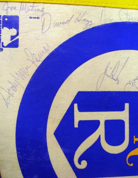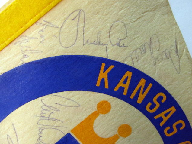 pennant. autographed 1978-80 KANSAS CITY ROYALS. blue and gold on white. yellow border. tip is intact. large team logo. autographed in blue ballpoint by 20 team players plus another one on reverse. includes: Rich Gale; Randy McGilberry; Manny Castillo; Jim Gaudet; Gary Christenson; Amos Otis; Clint Hurdle; Dave Chalk; et al. many of the names I do not recognize - possibly from spring training. tiny pin holes in corners. very good to excellent. 25.00