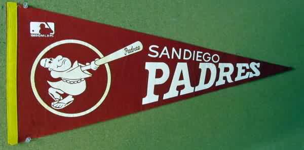 pennant. SAN DIEGO PADRES. white on red with golden yellow border. tip intact. has the Swinging Padre logo. dated 1969 MLPBC logo. First Year. pinholes in corners. full size approx. 30" long. excellent plus or nicer. 45.00