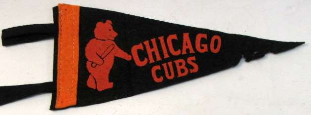 pennant. CHICAGO CUBS with bear mascot holding bat. orange lettering on black soft felt. orange border with black tassels. tip intact. small pinholes in corners. MOTH DAMAGE along bottom edge near tip. late 1940's vintage. colors are strong. approx. 8.75" long not counting tassles. 21.00