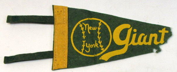 pennant. NEW YORK GIANTS. yellow lettering on green soft felt. yellow border with green tassels. late 1940's vintage. colors are strong. approx. 6" long not counting tassles. please note that it is missing the whole front half to the point. still a scarce pennant. 8.00