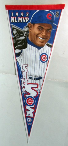 pennant. Chicago Cubs SAMMY SOSA 1998 NL MVP. multicolored portrait of him. red border. designed to hang vertically. 30" long. excellent plus. 15.00