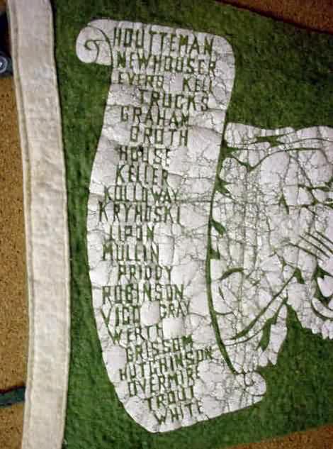 pennant. DETROIT TIGERS. white on soft green felt. has scroll listing the team roster. white border with green tassels. the lower tassels have been shortened. the tip is off. there is much crazing (cracking) to the lettering. but the pennant is clean and still displays nicely. undated but circa 1949 issue. roster reads: Houtteman; Newhouser; Evers; Kell; Trucks; Graham; Groth; House; Keller; Kolloway; Kryhoski; Lipon; Mullin; Priddy; Robinson; Vico; Gray; Werth; Grissom; Hutchinson; Overmire; Trout and White. well worn but still decent and SCARCE! 150.00