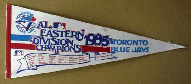 pennant. TORONTO BLUE JAYS - 1985 A.L. EASTERN DIVISION CHAMPIONS. red/turquoise blue and dark blue on white. team logo with list of the players names. issued in 1985. just shy of 30" long. minor wear to tip. very minor smudge along top edge. unused. near mint. 17.50