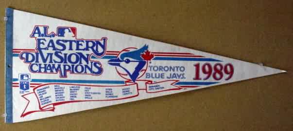 pennant. TORONTO BLUE JAYS - 1989 A.L. EASTERN DIVISION CHAMPIONS. red; turquoise blue; dark blue on white. team logo with list of the players names. issued in 1989. just shy of 30" long. minor wear to tip. unused. near mint. 16.50