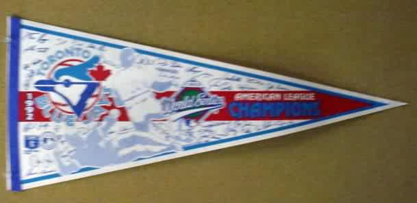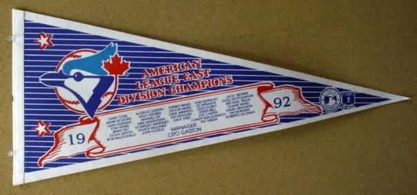 pennant. TORONTO BLUE JAYS - 1992 AMERICAN LEAGUE EAST DIVISION CHAMPIONS. red; turquoise blue; dark blue on white with blue horizontal stripes. team logo with name of the players listed. issued in 1992. stiffer material. just shy of 30" long. minor wear to tip. unused. near mint. 16.00