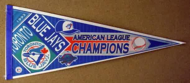 pennant. TORONTO BLUE JAYS - 1993 AMERICAN LEAGUE CHAMPIONS with logo for the 1993 World Series. multicolored. issued in 1993. stiffer material. just shy of 30" long. minor wear to tip. unused. near mint. 16.50