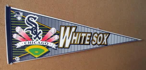 pennant. CHICAGO WHITE SOX. multicolored on black & white. black border. graphics of baseball flying out of stadium. 30" long. late 1980's to early 1990's. made by Wincraft. tip intact. near mint to mint. 17.00