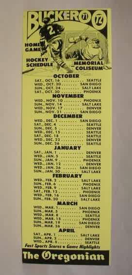 large schedule card poster. 1971-72 PORTLAND BUCKEROOS. Home Schedule. heavy cardboard. large approx. 6" by 17". plain reverse. black on yellow. advertising The Oregonian newspaper at bottom. nice hockey graphics at top. no flaws. near mint to mint. 60.00