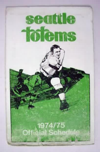 sked. 1974-75 SEATTLE TOTEMS. 4 fold. Illustration of player #5 on front. Jack-In-The-Box. kept in someone's wallet. edge wear. very good. hard one to find. 12.50