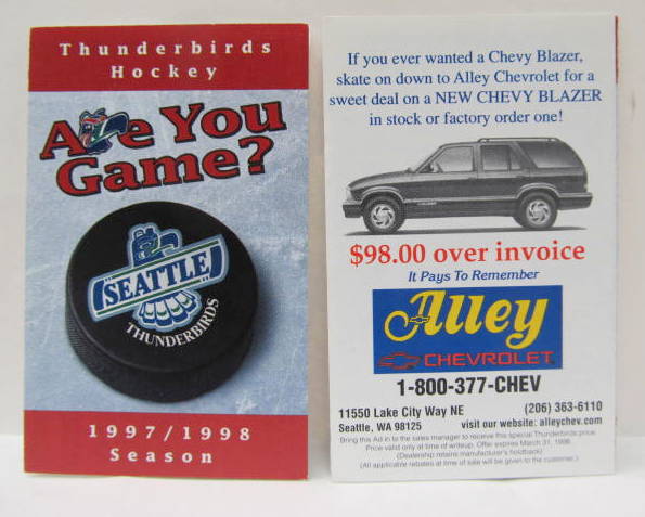sked. 1996-97 SEATTLE THUNDERBIRDS. Player #12. Alley Chevrolet. near mint to mint. 3.00