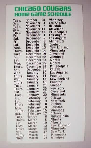 sked. 1974-75 CHICAGO COUGARS. WHA. green & white; logo on front; Allen’s & radio stations; near mint to mint. 12.50