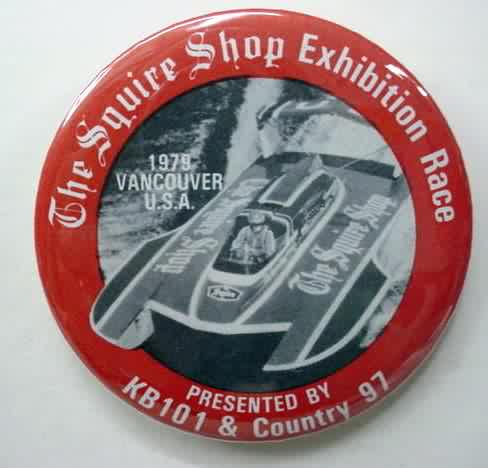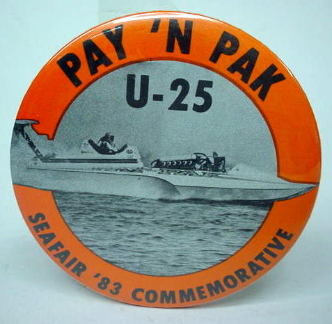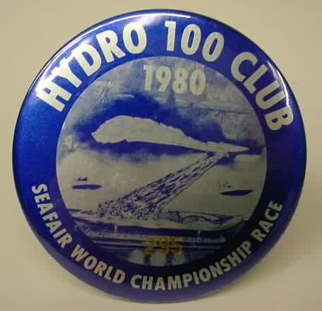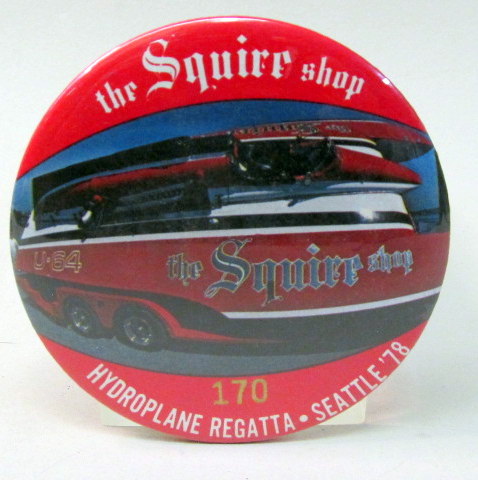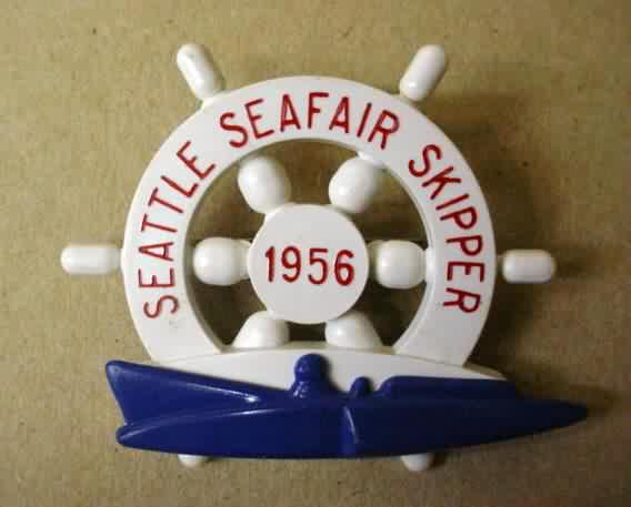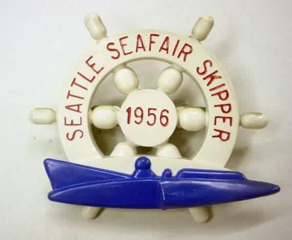 1956 SEATTLE SEAFAIR SKIPPER PIN. large type wheel. white with red lettering. dark blue hydroplane boat. no flaws. mint. 55.00