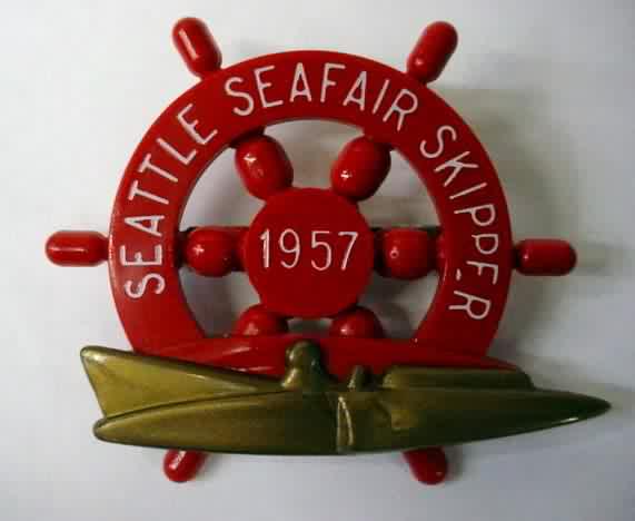 1957 SEATTLE SEAFAIR SKIPPER PIN. large type wheel. red with white lettering. gold bronze hydroplane boat. no flaws. mint. 39.00