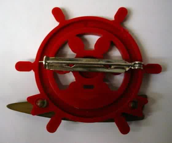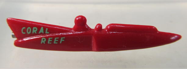 scarce 1958 CORAL REEF red plastic figural hydroplane race boat pin. approx. 2" long. green decal on red. lock pin on reverse side. no flaws. near mint to mint. sorry sold