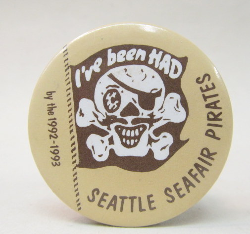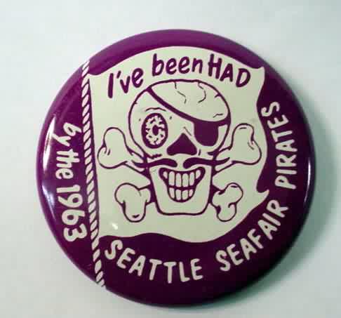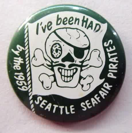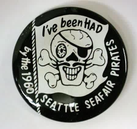 1960 I'VE BEEN HAD by the SEATTLE SEAFAIR PIRATES Hydroplane boat racing related pinback button. black and white. 2.25" diameter tin litho. small surface nick on the "6". reverse is bright and shining. overall near mint. these early Pirate pins are getting SOOOOO hard to find in nice shape! 39.50