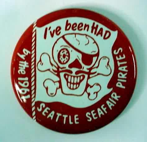 1961 I'VE BEEN HAD by the SEATTLE SEAFAIR PIRATES Hydroplane boat racing related pinback button. red and white. 2.25" diameter tin litho. reverse is bright and shining. near mint plus to mint. these early Pirate pins are getting SOOOOO hard to find in nice shape! 29.50