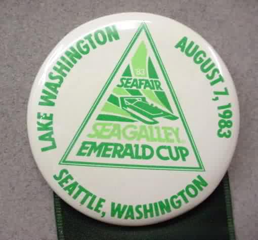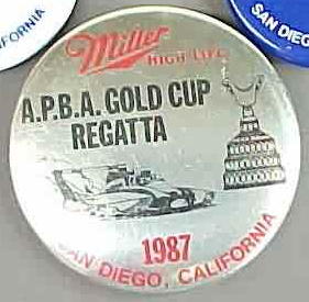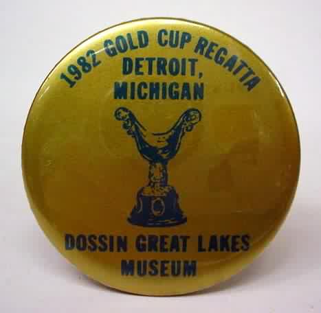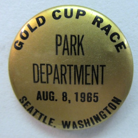 1965 GOLD CUP RACE SEATTLE WASHINGTON PARK DEPARTMENT. black on gold. 2" diameter celluloid. has paper RICHMARK label on reverse. mint. scarce oddball item! sorry sold