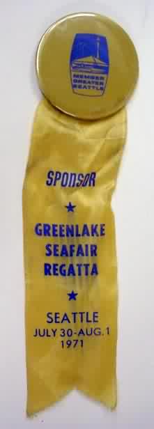 Seattle 1971 GREENLAKE SEAFAIR REGATTA SPONSOR Badge & Ribbon. blue on gold 2.25" diameter celluloid pinback button with 2" wide ribbon blue on golden yellow ribbon. Overall 8.5" long. scarce. colors bright and vivid. wrinkles in ribbon. overall near mint or better. 34.50