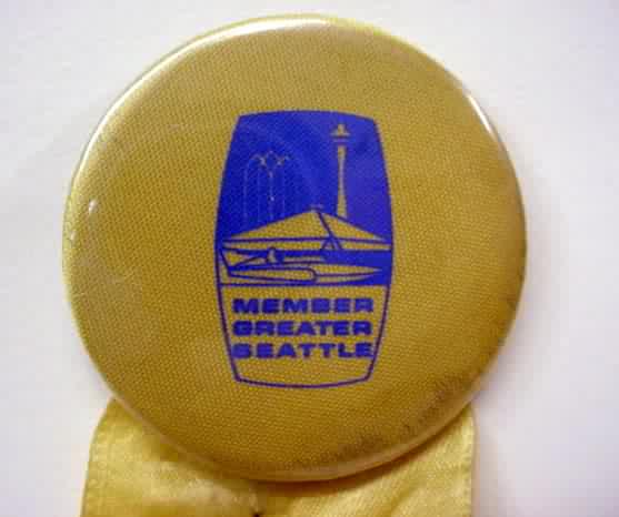 1967 SEAFAIR GREATER SEATTLE white in blue plastic pin. excellent. Has raised image of the Space Needle and Seattle Center. 6.50