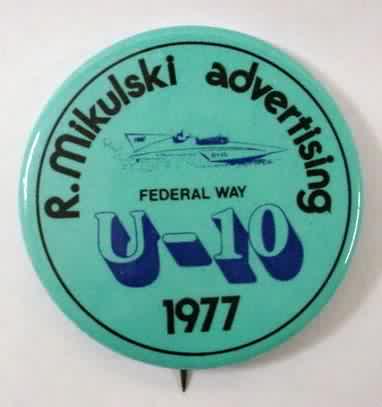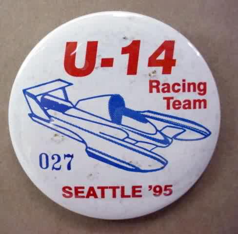 1993 U-14 RACING TEAM SEATTLE #027 hydroplane pinback button. Red and blue on white. 2.25" diameter celluloid. Reverse is clean; no rust. colors bright and vivid. No signs of rust but there is light spotting in background. near mint condition. sorry sold