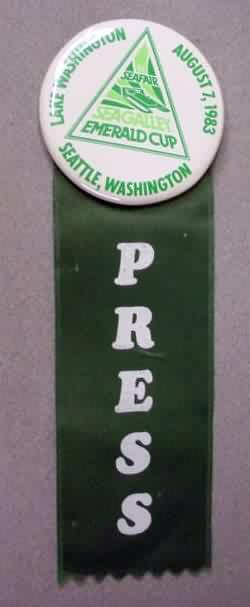 official pass. August 7 - 1955. Cardboard name badge says GREEN LAKE GUEST - Gold Cup Races - 1955. Attached is green silk ribbon with dark gold lettering. Illustration of hydro boat; reads SEAFAIR GOLD CUP REGATTA; SEATTLE WASHINGTON AUG. 7 1955. Early passes like this are hard to come by. 39.50