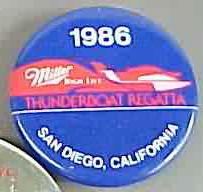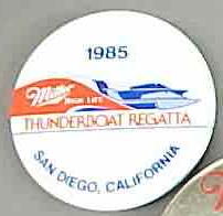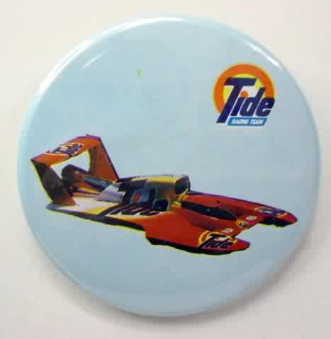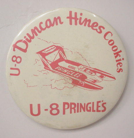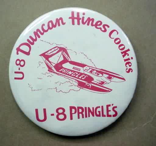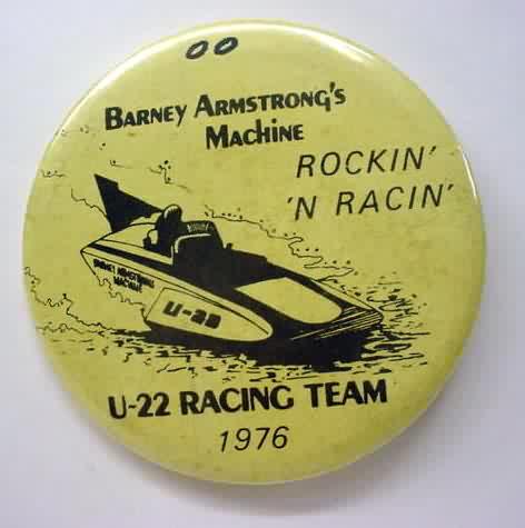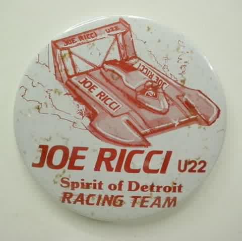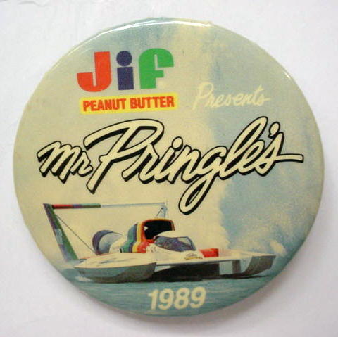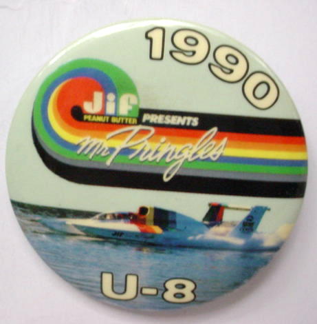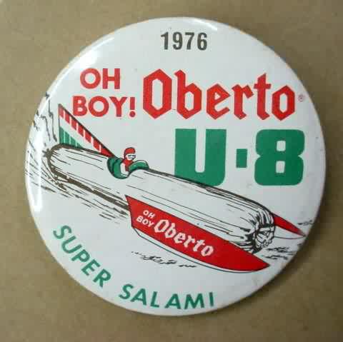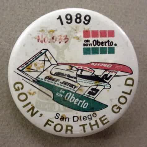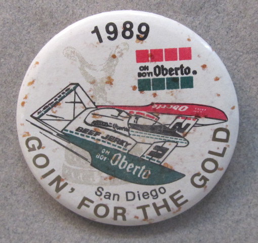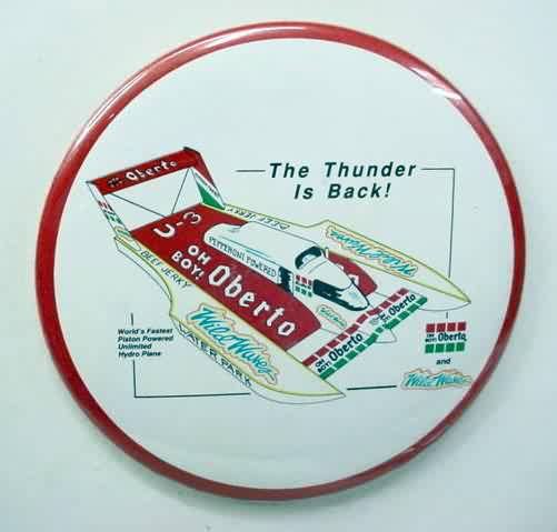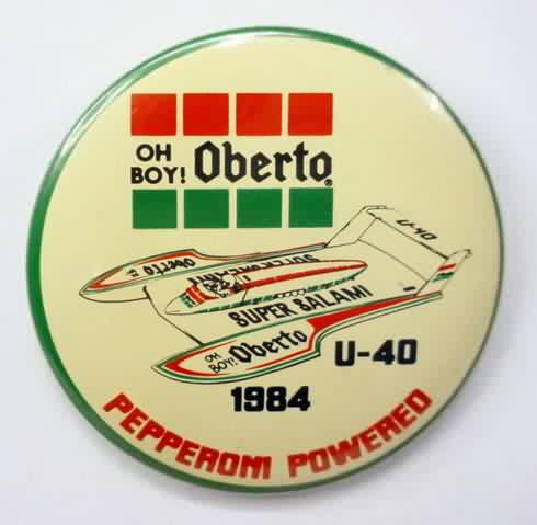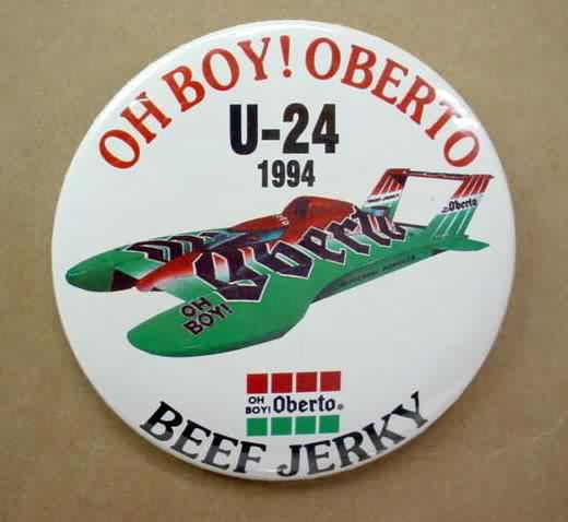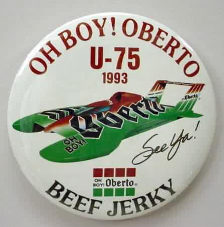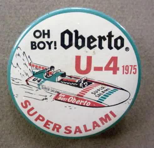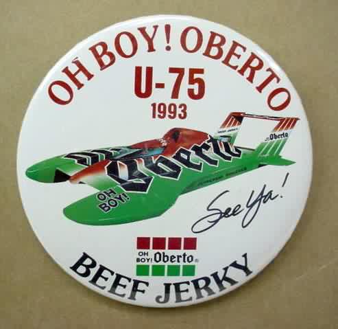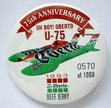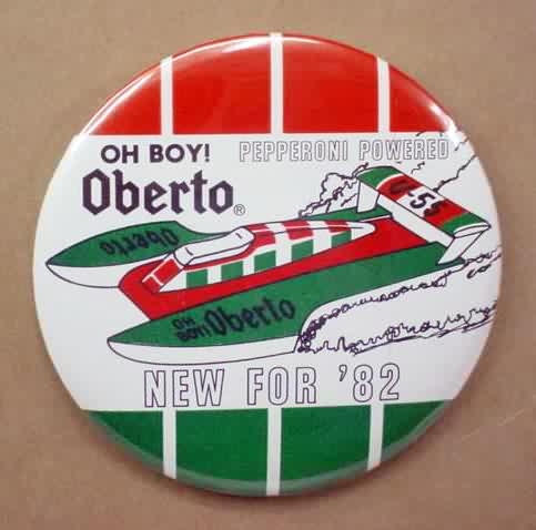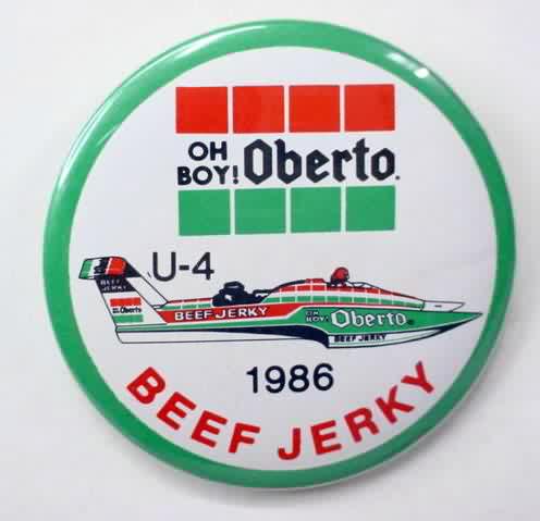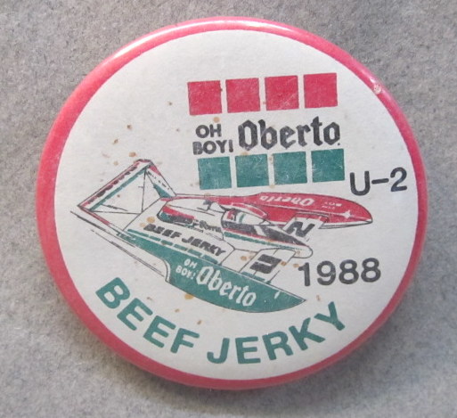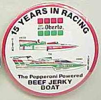 3" diameter celluloid pinback. OBERTO 15 YEARS IN RACING with illustration of the 1975 piston boat and the 1990 turbine boat. "The Pepperoni Powered Beef Jerky Boat". mint. 5.00