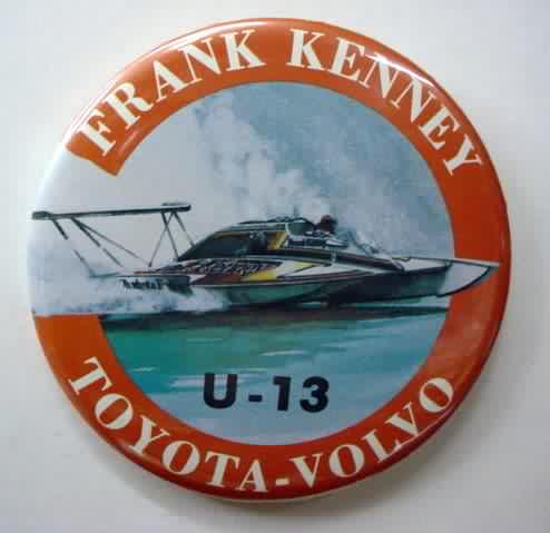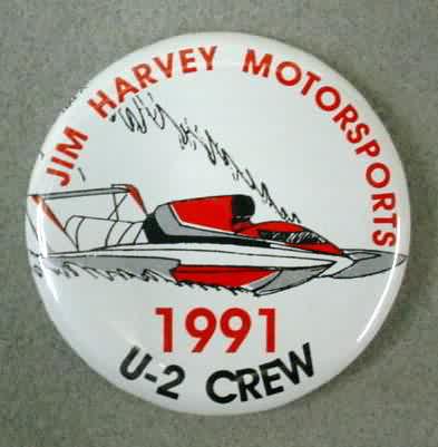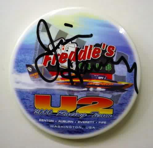 2000 FREDDIE'S CLUB U-2 hydroplane pinback button. signed by JIM HARVEY. 3" diameter celluloid. reverse is clean; no rust. no flaws. superior condition. sorry sold