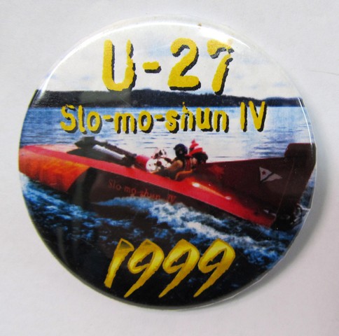 1999 SLO-MO-SHUN IV full color photo hydroplane boat racing pinback button. celluloid. 2.25" diameter. reverse is bright and shining. no flaws. mint condition. 8.50