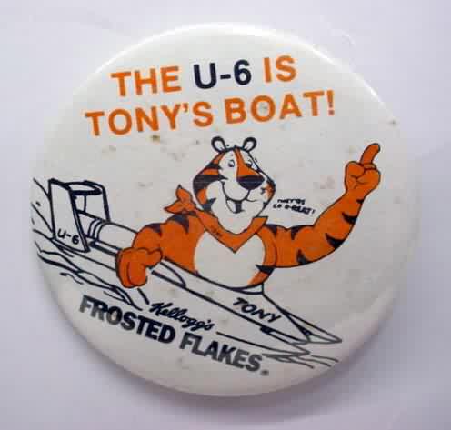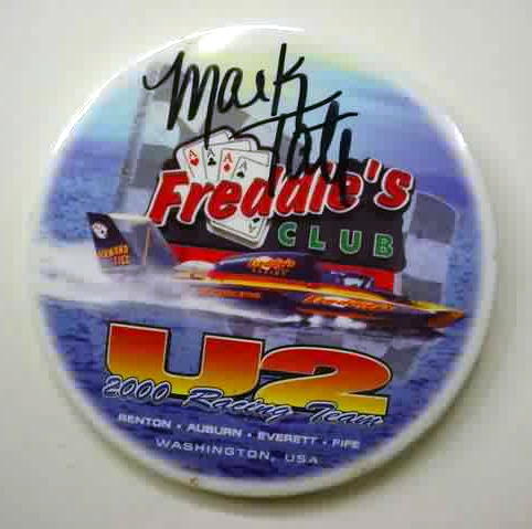 2000 FREDDIE'S CLUB U-2 hydroplane pinback button. autographed by MARK TATE. 3" diameter celluloid. reverse is clean; no rust. no flaws. superior condition. sorry sold
