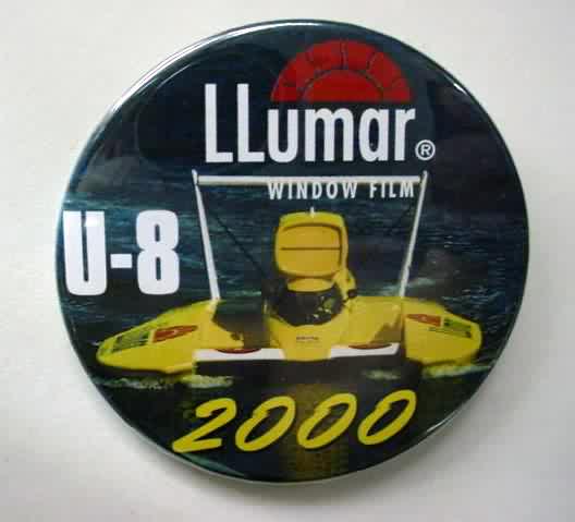 2000 LLUMAR red 2000 photo hydroplane pinback button. full color action photo of the boat. U-8 in YELLOW; 2000 in RED; NO checkerboard. 2.25" diameter celluloid. reverse is clean; no rust. no flaws. colors strong and bright. Superior condition. sorry sold