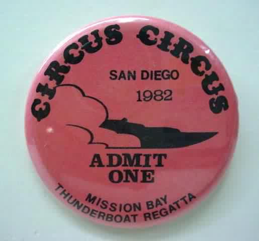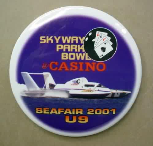 2001 SKYWAY PARK BOWL & CASINO U-9 SEAFAIR hydroplane pinback button. 3" diameter celluloid. Reverse is clean; no rust. colors bright and vivid. no flaws. superior condition. 27.50