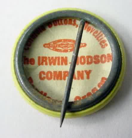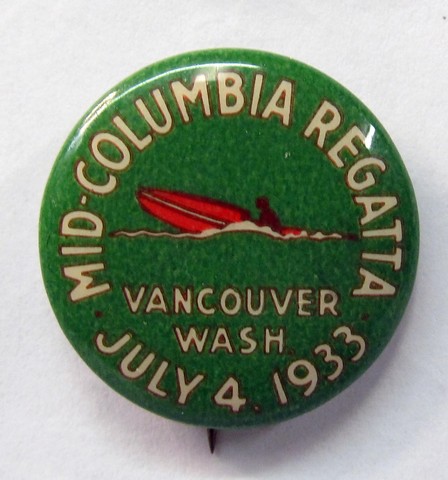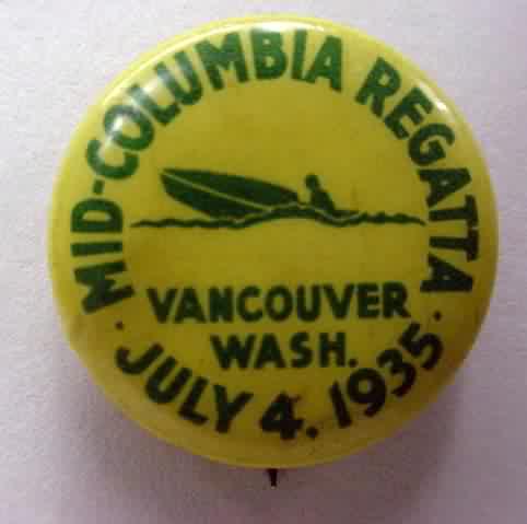 July 4 1935 MID-COLUMBIA REGATTA - VANCOUVER WASH. Celluloid pinback button. green on yellow w/illustration of boat in center. Manufacturer's paper label is intact. Made in Portland Oregon by Irwin Hodson Company. 7/8" diameter. colors are strong. no flaws. early and scarce! sorry sold