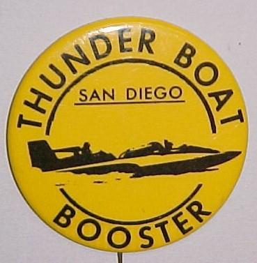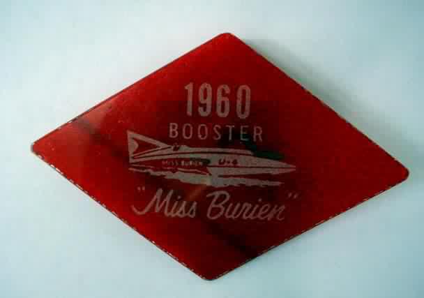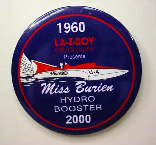 issued in 2000; 1960 LA-Z-BOY MISS BURIEN HYDRO BOOSTER hydroplane pinback button. 3" diameter celluloid. reverse is clean; no rust. colors strong. no flaws. Superior condition. 6.50