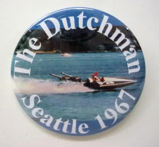 1999 issue THE DUTCHMAN SEATTLE 1967 hydroplane pinback. Full color action photo. 2.25" diameter celluloid. reverse is clean; no rust. colors strong. No flaws. Superior condition. 8.50