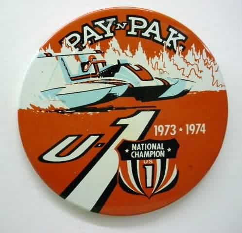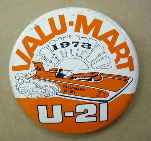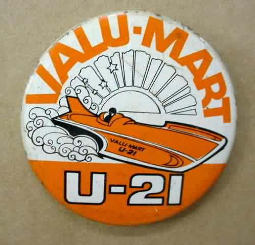 1973 U-21 VALU-MART hydroplane pinback button. orange on white. Illustration of boat. 2.25" diameter tin litho. Reverse is clean; no rust. colors bright and vivid. minor edge wear. excellent or nicer. 5.00