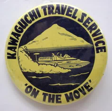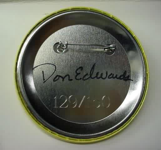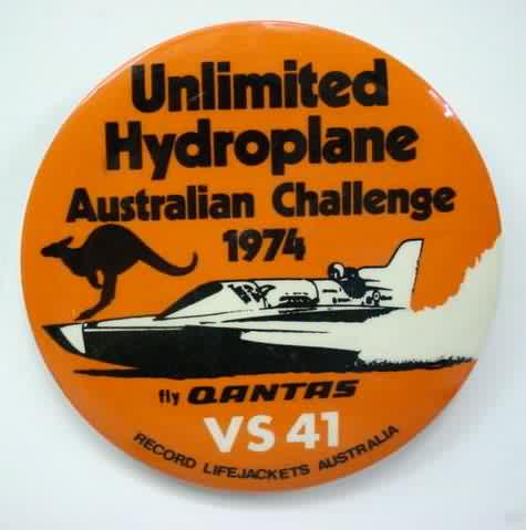 (I believe this was issued in the mid 1970's) 1969 GOLDEN KOMMOTION hydroplane pinback button. "Don Edwards Allison T-40 Turbine Unlimited Hydroplane". black on dark yellow. approx. 3" diameter celluloid. reverse is clean; no rust. no flaws. superior condition. 21.50