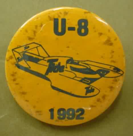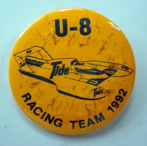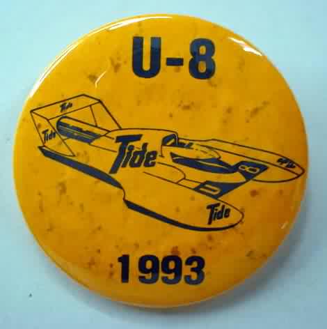 1993 TIDE U-8 orange hydroplane pinback button. black on orange. only 100 made. the speckling is from poor paper quality; done at time of manufacturing. 1.75" diameter celluloid. reverse is clean. no rust. colors bright and vivid. no flaws. superior condition. sorry sold