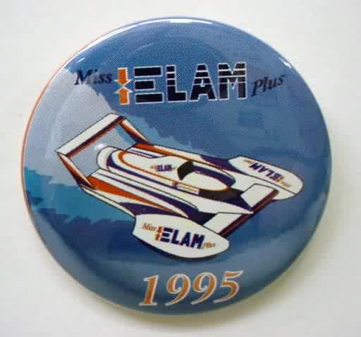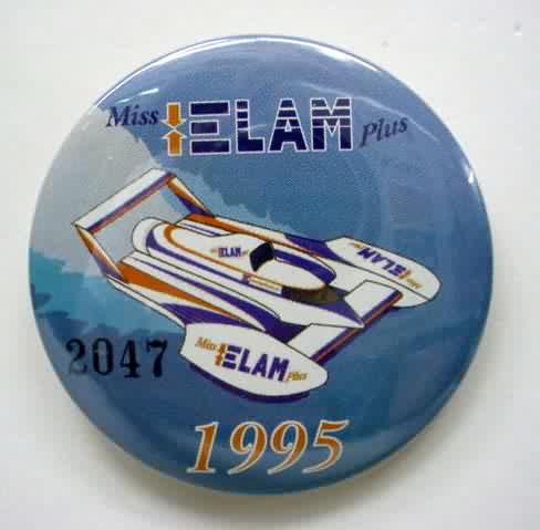 1995 MISS ELAM PLUS hydroplane pinback button. Serial numbered #2047. full color picture of the 3-point boat on blue background. 2.25" diameter celluloid. reverse is clean; no rust. colors strong. no flaws. Superior condition. 12.50