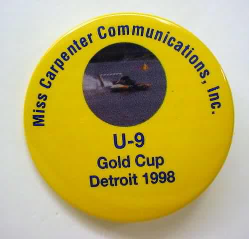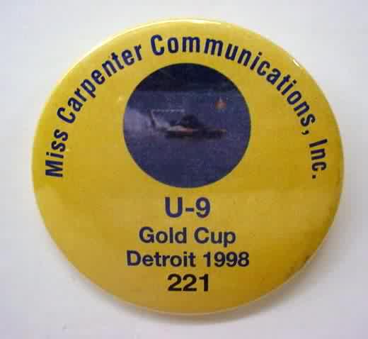 1998 MISS CARPENTER COMMUNICATIONS U-9 GOLD CUP DETROIT numbered hydroplane pinback. numbered #221. small color photo inset at top; lighter yellow. 2.25" diameter celluloid. reverse is clean; no rust. colors strong. very light surface wear. near mint to mint condition. 14.00